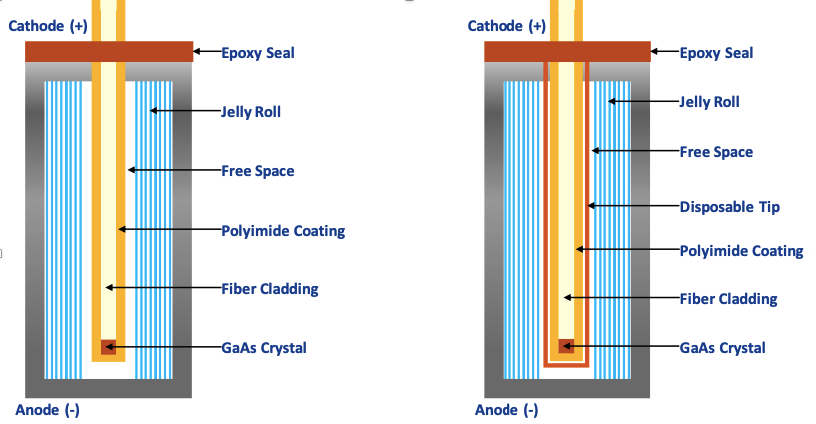 光纖溫度傳感器可以在單元形成階段或之后安裝。與在制造的電池芯上安裝傳感器相比,在電池形成階段安裝傳感器很簡(jiǎn)單。下面的圖1顯示了如何將光纖溫度傳感器安裝到圓柱形電池芯中的詳細視圖。